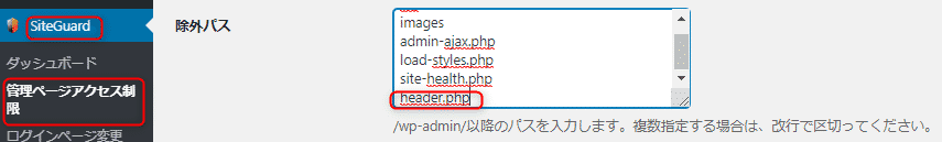 「管理ページアクセス制御」をOFFにするか、ONのまま除外パスに「header.php」を加える。