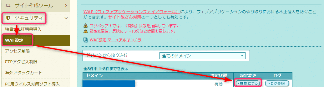 ログインし「セキュリティ」➡「WAF設定」を開き、「無効にする」ボタンを押す。(設定状態が「無効」になる)