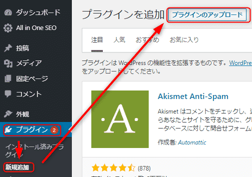 「プラグイン」➡「新規追加」画面を開き、「プラグインのアプロード」を押す。