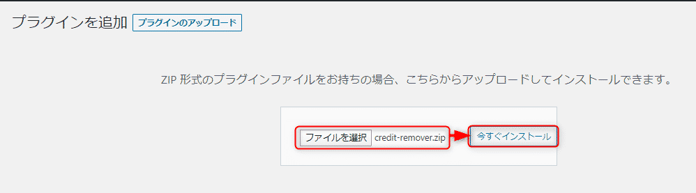 「ファイル選択」で、「クレジット削除プラグイン」フォルダ内の「credit-remover.zip」を選択し、「今すぐインストール」を押す。