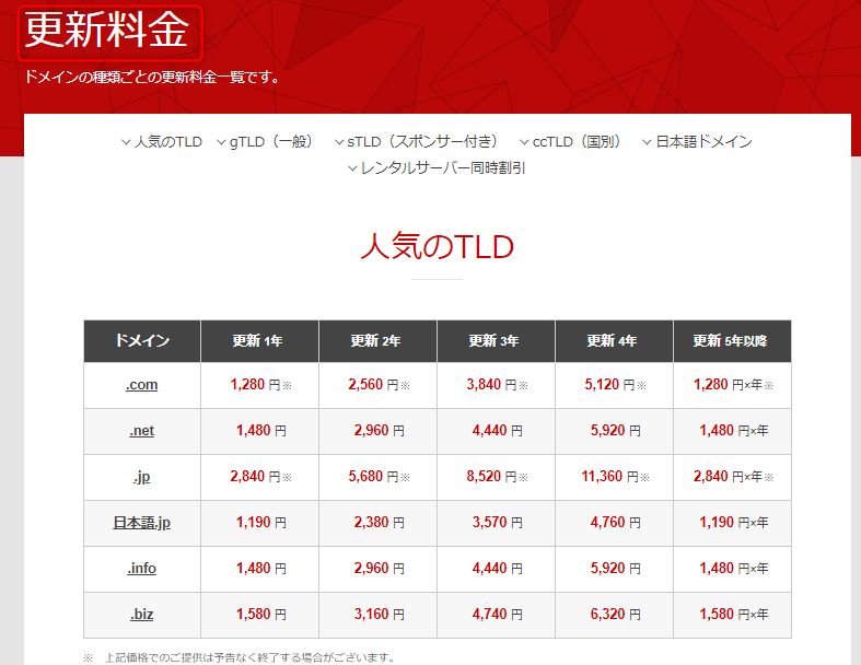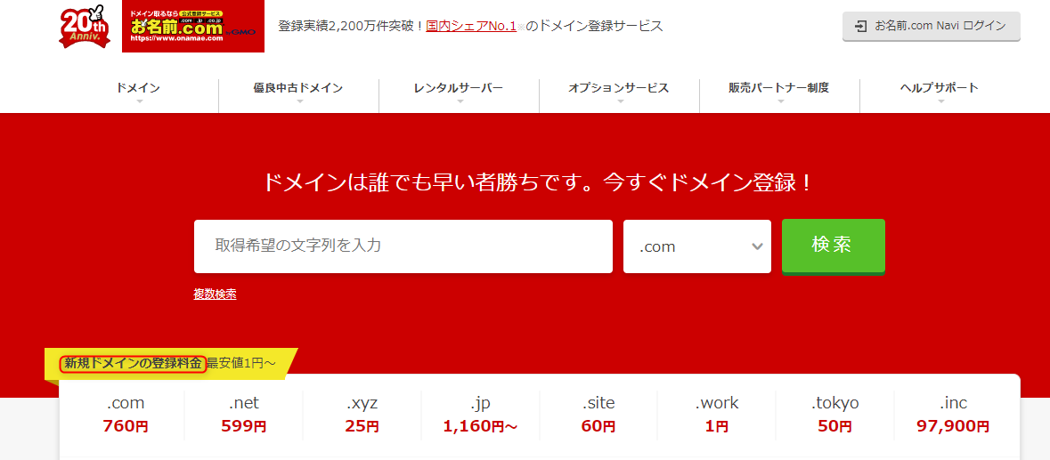 こちらは、お名前ドットコムの、ドメイン取得時の登録価格です。 (時期やキャンペーンによって価格は異なります)