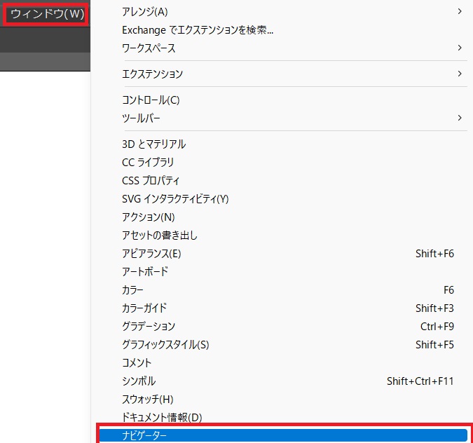 メニューバーの「ウィンドウ」から「ナビゲーター」を選択する。