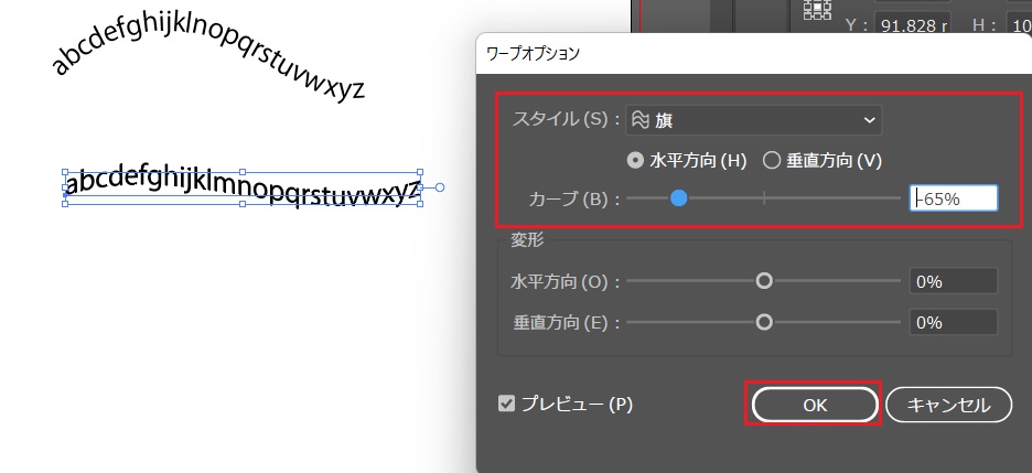 「ワープオプション」の設定をし、「OK」を押す。