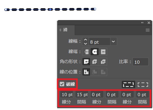 「破線」にチェックし、線分、間隔を設定する。線幅や線端の設定もここでできます。