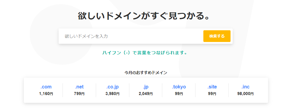 ムームードメイントップページで、欲しいドメインを探します。