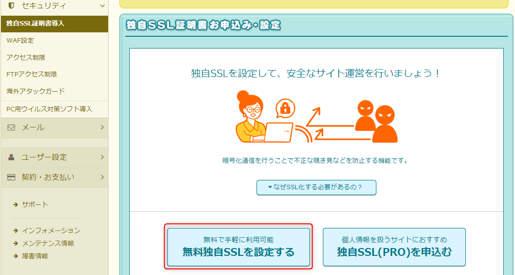 SSLをさらに強化したい場合は、有料の「独自SSL(PRO)」を申し込んでくださいね。
