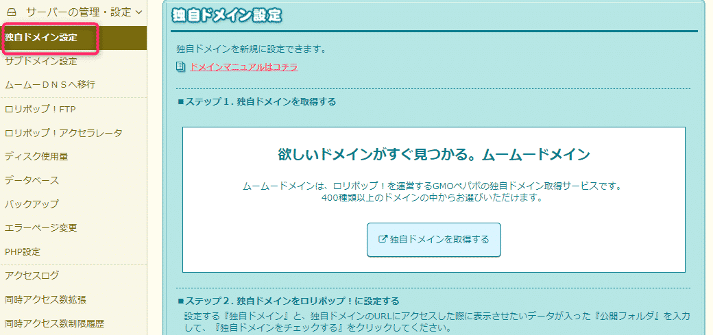 「独自ドメイン設定」画面を開きます。