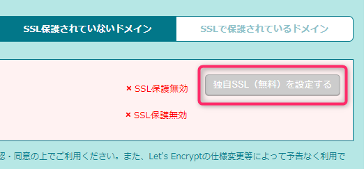 SSL設定をしたいドメインに✔をし、「独自SSL(無料)を設定する」を押す。